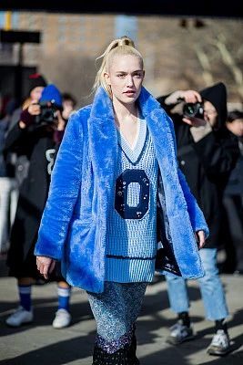 纯色宽条的v领毛衣更加的低调奢华,适合喜欢简洁风格的女孩子穿。整套两三年的搭配很亮眼,下身的蓝色和黑色蕾丝拼接半裙十分的有层次感,可以说是这套搭配的亮点,外套如果是黑色的效果会更加冷艳。