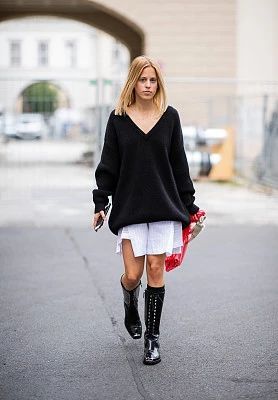 中长款靴子配上v领卷边毛衣,是不是特别的温柔呢?美姐给大家推荐的都是欧美的最火爆款,所以现在看起来可能不太能一下子就接受,不过很快这些潮流就会在国内流行,这点美姐非常自信。