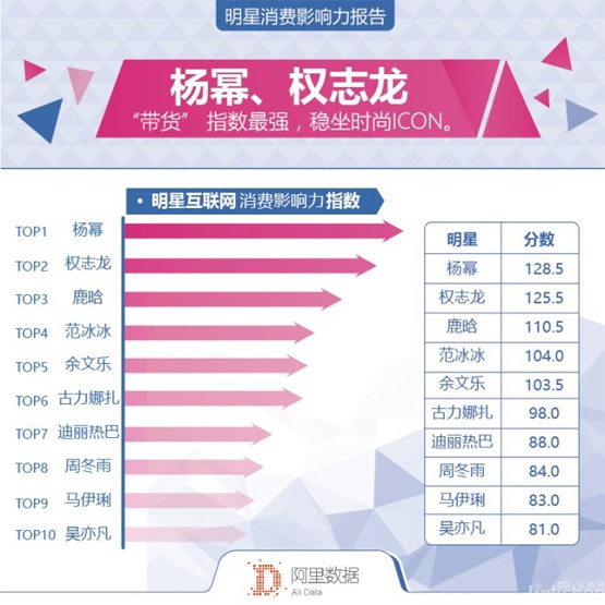 淘宝做过统计,杨幂同款有将近上千万,夸张的时候甚至上亿件的销量。阿里数据则根据今年7-9月份用户搜索的兴趣度、明星同款及周边商品的覆盖度以及交易热度,计算出了不同明星的“带货指数”。结果显示,杨幂综合得分最高。
