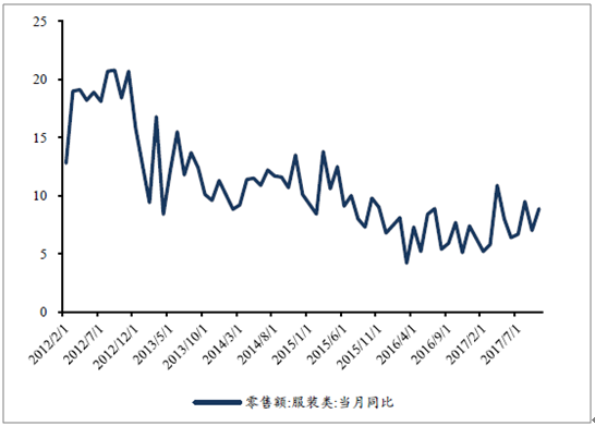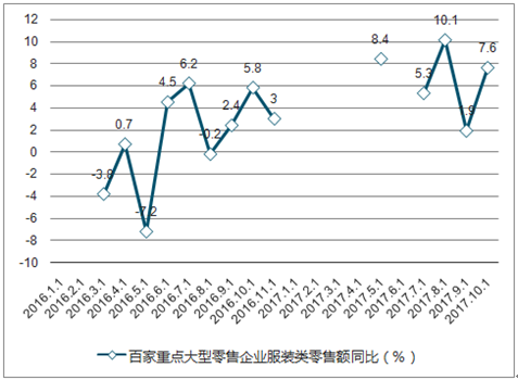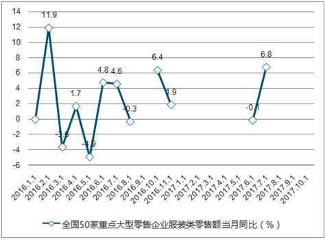2017年年初至今限额以上零售额:服装类:当月同比(%)