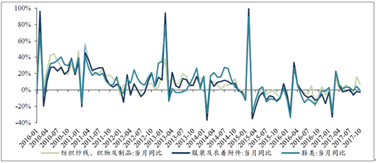 出口方面,纺织品、服装、鞋类10月同比增速分别为6.83%、-2.84%、-0.75%。2017年前10个月累计同比为2.58%、-2.32%、1.74%。