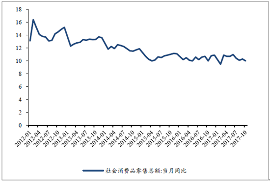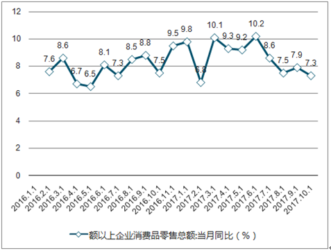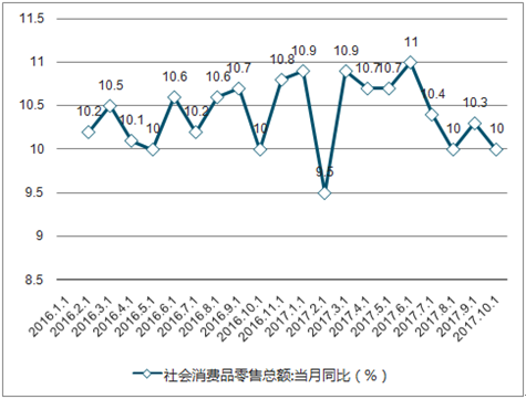 2016年年初至今社会消费品零售总额:当月同比(%)
