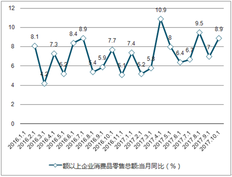 16年年初至今限额以上企业消费品零售总额:当月同比(%)
